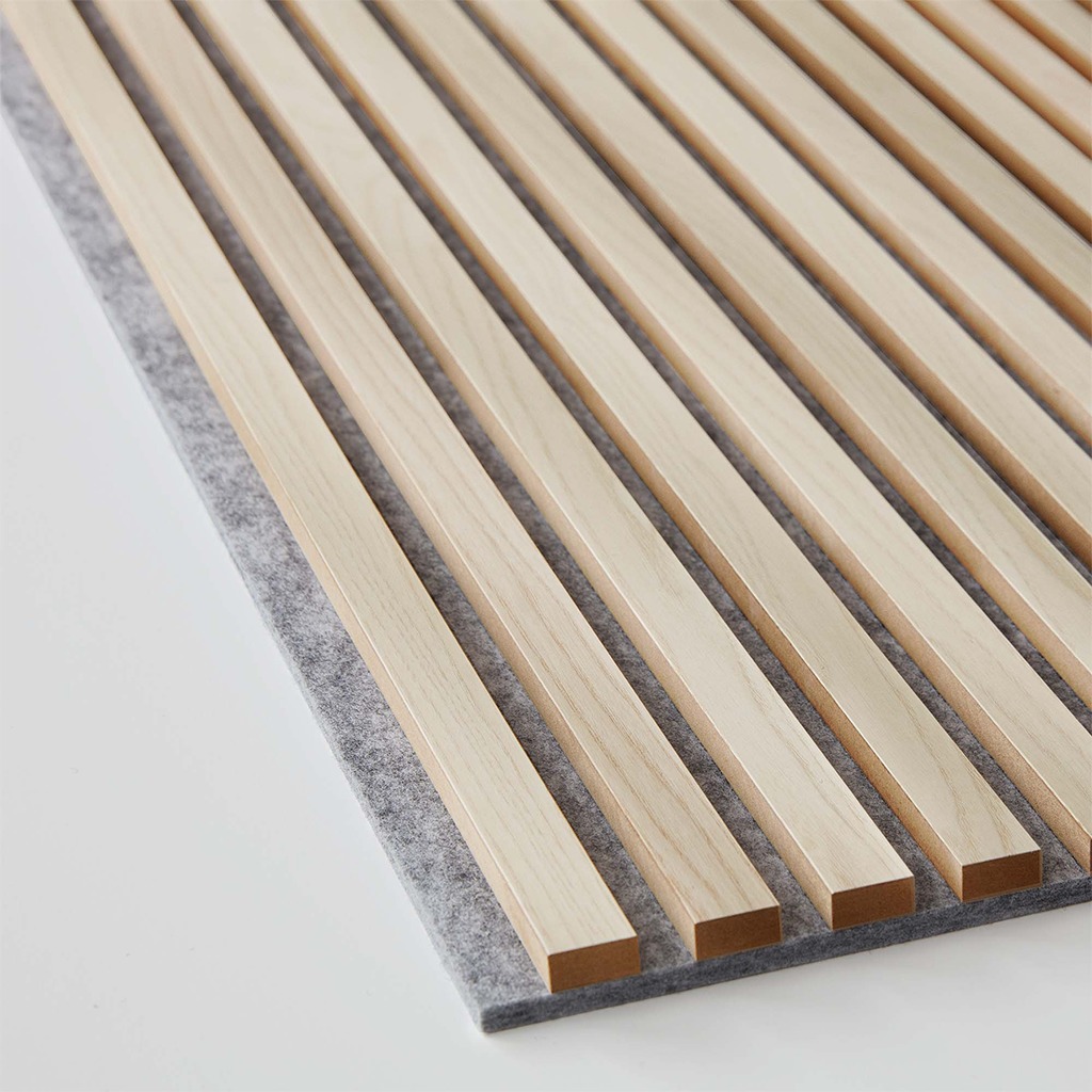 Diamond akustický lamelový panel s bielymi pigmentovými lamelami so svetlou jaseňovou dyhou na akustickom plstenom základe.. Vďaka lesklému hodvábnemu povrchu vyzerá tento panel luxusne. Lakovaná povrchová úprava poskytuje panelu, ktorý je nielen odolný a bez údržbový, ale dodáva lamelám aj úplne iný lesk pre zvýraznenie svetlých tónov lamelového panelu. Akustická plsť je vyrobená z recyklovaného plastu (predovšetkým plastové fľaše) a lamely sú vyrobené z MDF s dyhovým povrchom. Vyčistite ho pomocou prachovej metly, vysávača alebo tvrdo vyžmýkanou handričkou.