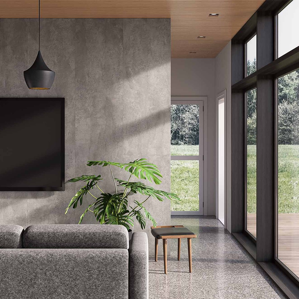 Chcete pocit cementovej steny bez nepríjemných ozvien? Cementový stenový panel dodáva autentický dojem betónového/cementového povrchu. Dokonca aj skúsení interiéroví dizajnéri môžu mať problém rozlíšiť Cement od originálu. Dodáva miestnosti jemný a pôsobivý pocit.